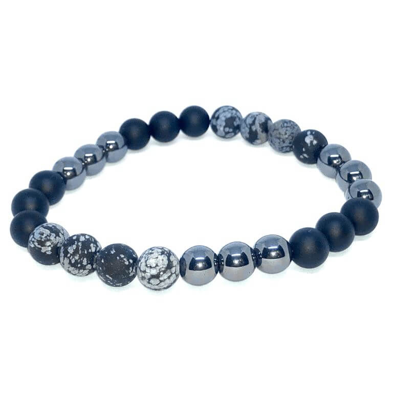 Minerální náramek z hematitu, onyxu a vločkového obsidiánu - Ochránce podporuje sny a záměry. Dodává vnitřní sílu, odhodlání, soustředí, klid, pohodu a ochranu. Ochránce patří mezi minerální náramky pro muže, v menší velikosti je ale vhodný i pro ženy :) Požadavek na zmenšení uveďte do objednávky.