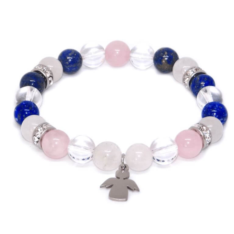 Něžný a originální minerální náramek Anděl. Pohladí duši. Křišťály podporují čistotu úmyslu, harmonii a vnitřní světlo. Lapis lazuli uvolňuje napětí, komunikaci, dodává pohodu, klid a soulad. Růženín pohladí svou něhou, láskou a fantazií. Vše jemně doplňuje přívěsek a zářivé rondelky.