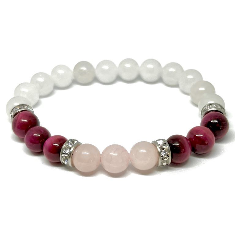 Minerální náramek z růženínu, křišťálu a tygřího oka propojuje ochranou sílu tygřího oka s láskou a něhou růženínu za pomoci harmonie křišťálu. Růžička mezi náramky z minerálů vždy potěší.