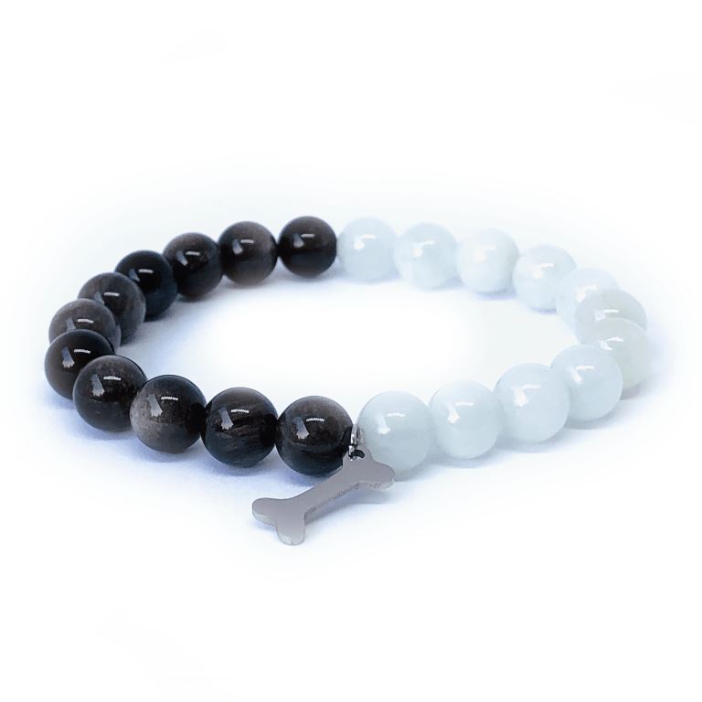 Minerální náramek vznikl spojením obsidiánu tedy kamene (sebe)uvědomění s jadeitem tedy kamenem rovnováhy, péče a citu.