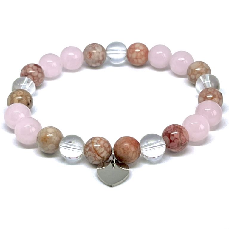 Vhodné na zápěstí 16-17 cm. Velikost korálků je 8 mm. Přívěsek je z chirurgické oceli 316L (srdíčko). Srdce je symbolem lásky.