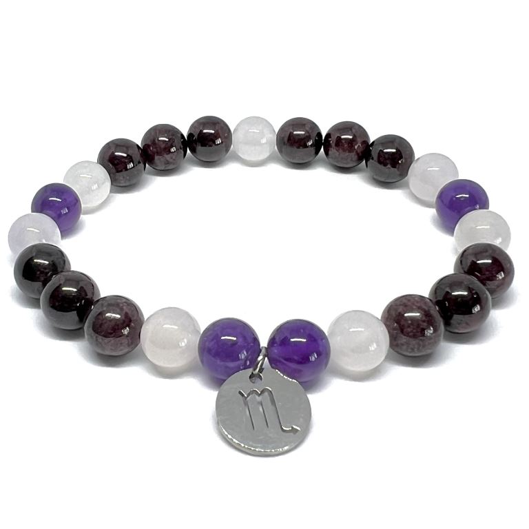 Náramek je zkombinovaný z polodrahokamů, které se pro štíra přesně hodí. Minerální náramky pro štíra, jakožto trpělivé vodní znamení s hlubokou duší vystihují skvěle ametyst v kombinaci s achátem a granátem. Minerální korálky z přírodního kamene z hloubky zeměkoule.
