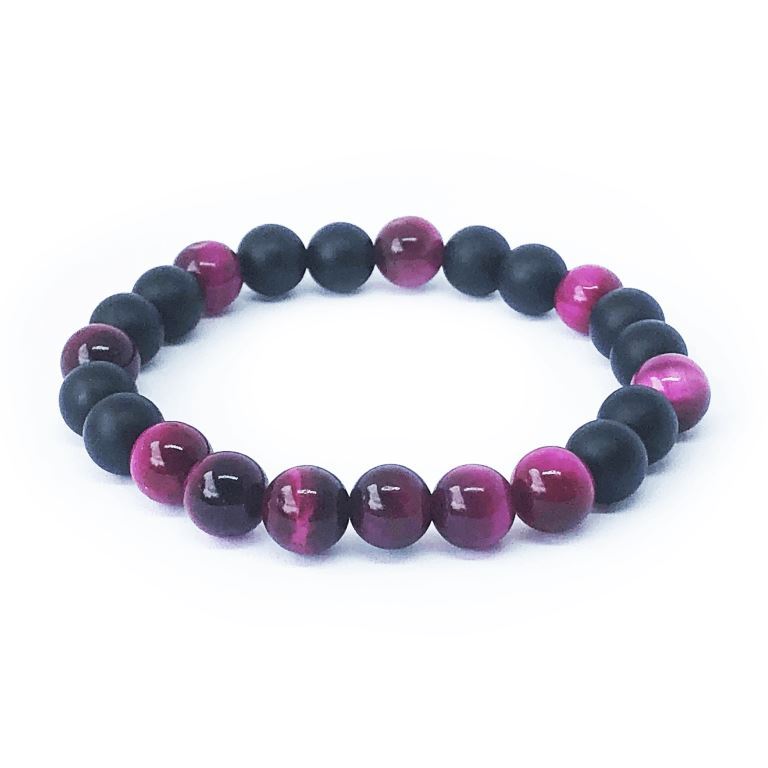 Kouzelné propojení barveného tygřího oka a onyxu. Náramek z minerálů růžové tygří oko a onyx je Kouzlo. Minerální náramek tvoří minerální kameny ochrany a podpory a minerální kameny vnitřní síly a odhodlání.