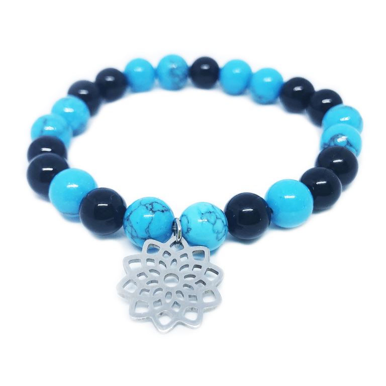 Magické barevné spojení onyxu a tyrkysu. Minerální náramek přináší sílu a odhodlání onyxu a klid a ochranu tyrkysu.